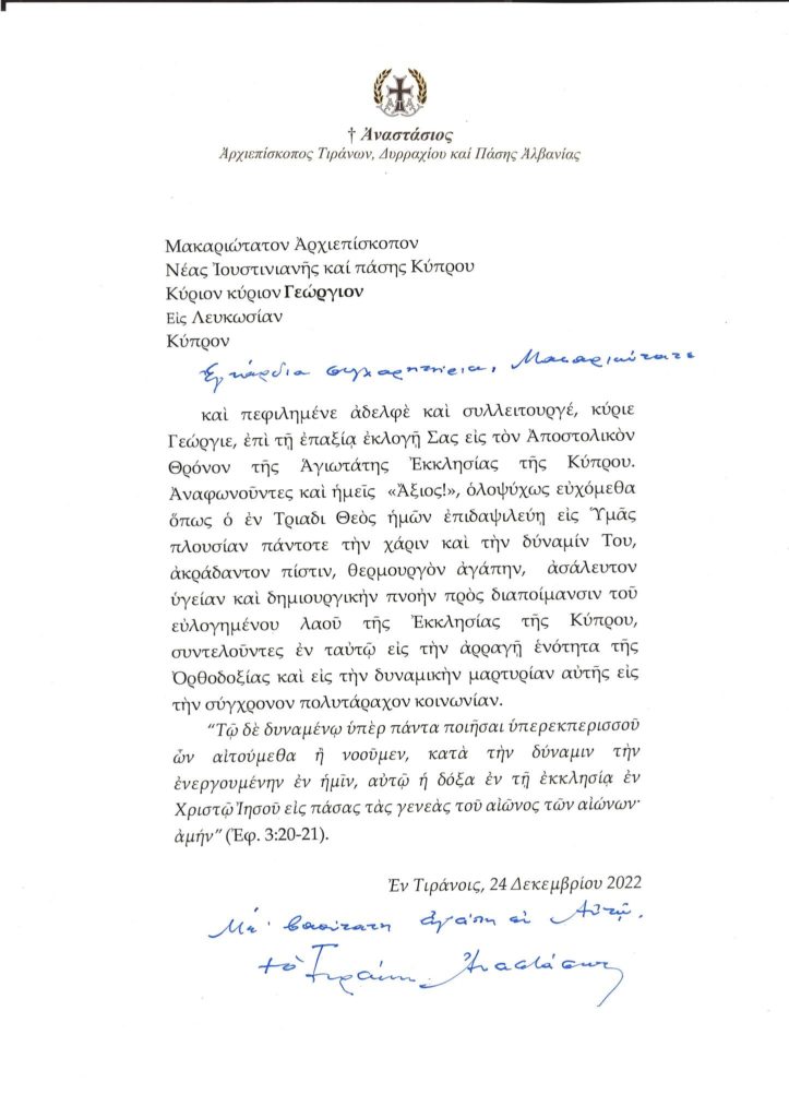 Συγχαρητήρια επιστολή προς προς τον Τοποτηρητή πρώην Μητροπολίτη Πάφου κ. Γεώργιο για την εκλογή του σε νέο Αρχιεπίσκοπο Νέας Ιουστινιανής και πάσης Κύπρου μετά την σχετική ψηφοφορία της Ιεράς Συνόδου της Εκκλησίας της Κύπρου, απέστειλε ο Μακαριώτατος Αρχιεπίσκοπος Τιράνων, Δυρραχίου και πάσης Αλβανίας κ.κ. Ανάστασιος.