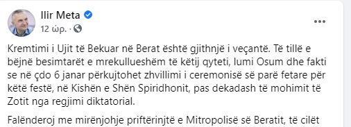 “Βρέθηκα στην εκκλησία του Αγίου Σπυρίδωνα για να εορτάσω μαζί με τους αλβανούς ορθόδοξους πιστούς τα Θεοφάνεια” γράφει ο Αλβανός πρόεδρος σε ανάρτησή του στα μέσα κοινωνικής δικτύωσης δημοσιεύοντας παράλληλα πολλές φωτογραφίες.