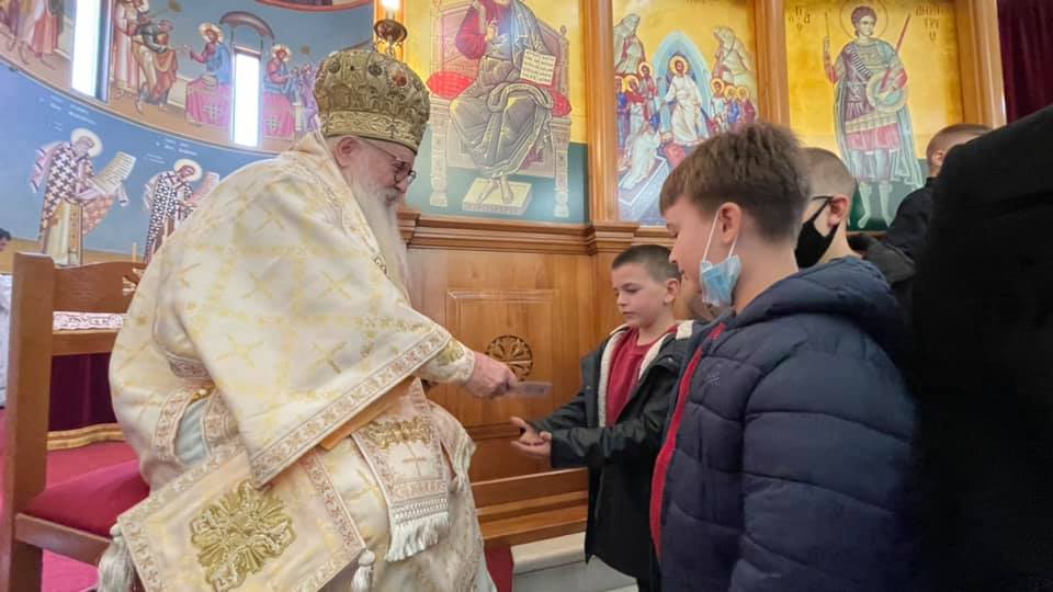 Ο Σεβασμιώτατος προεξήρχε της Θείας Λειτουργίας που τελέστηκε στον Καθεδρικό Ναό της πόλης ενώ στη συνέχεια δέχθηκε τις ευχές για έτη πολλά από πιστούς και μαθητές των σχολείων της Ιεράς Μητροπόλεως.