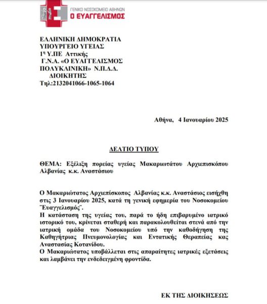 “Ο Μακαριώτατος Αρχιεπίσκοπος Αλβανίας κ.κ. Αναστάσιος εισήχθη στις 3 Ιανουαρίου 2025, κατά τη γενική εφημερία του Νοσοκομείου ¨Ευαγγελισμός¨. Η κατάσταση της υγείας του, παρά το ήδη επιβαρυμένο ιατρικό ιστορικό του, κρίνεται σταθερή και παρακολουθείται στενά από την ιατρική ομάδα του Νοσοκομείου υπό την καθοδήγηση της Καθηγήτριας Πνευμονολογίας και Εντατικής Θεραπείας κας Αναστασίας Κοτανίδου. Ο Μακαριώτατος υποβάλλεται στις απαραίτητες ιατρικές εξετάσεις και λαμβάνει την ενδεδειγμένη φροντίδα”, αναφέρει το ανακοινωθέν.