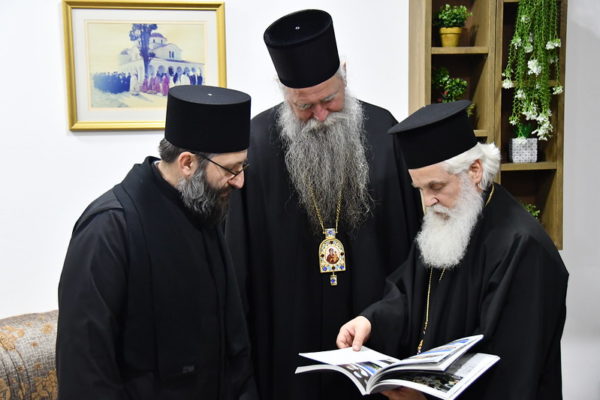 Τον Ιεράρχη της εν Σερβία Ορθοδόξου Εκκλησίας υποδέχθηκαν ο Μητροπολίτης Απολλωνίας και Φίερ κ. Νικόλαος, Διευθυντής της Θεολογικής Ακαδημίας εδρεύει στη Μονή, και ο Επίσκοπος Βύλιδος κ. Άστιος.