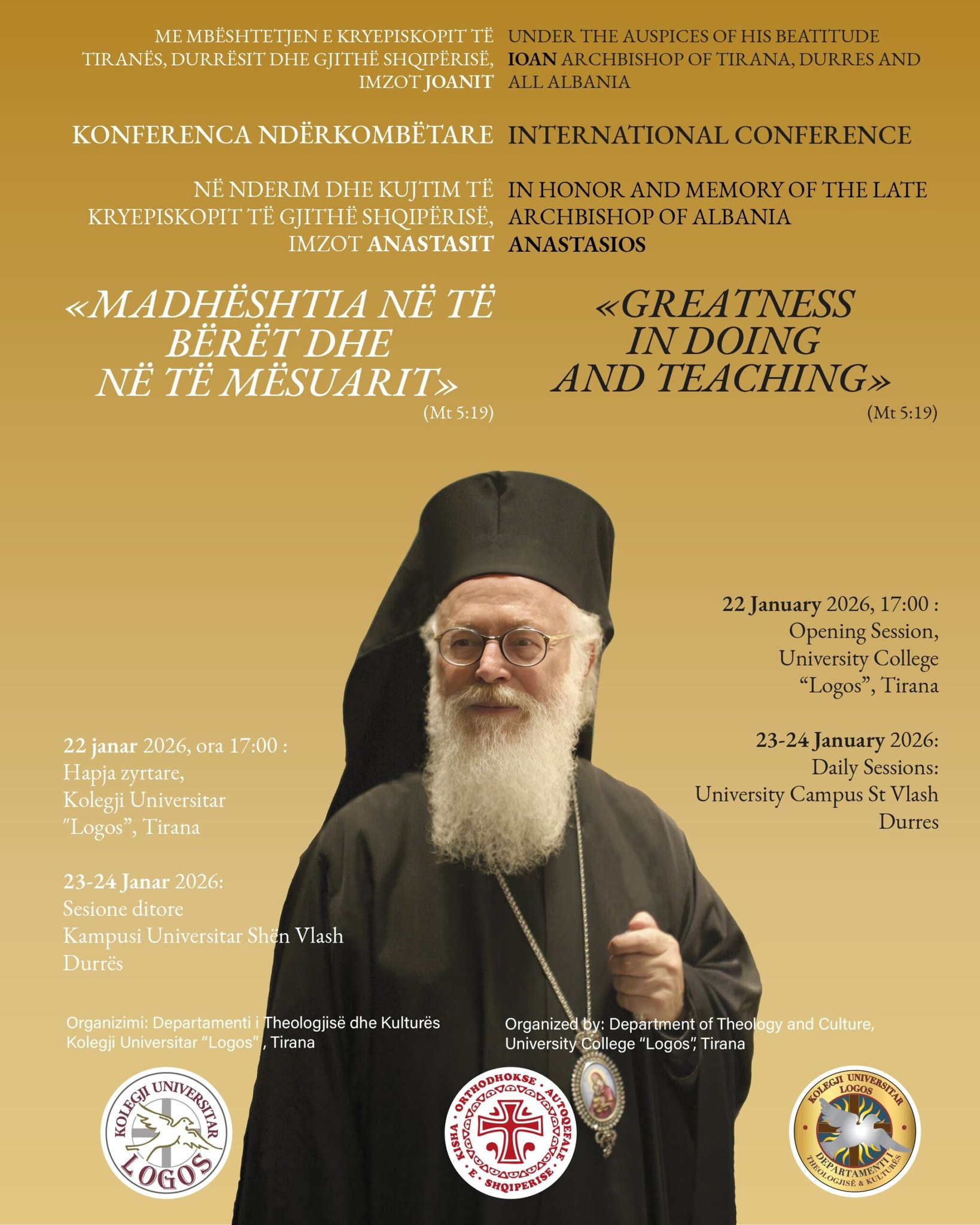 Εις τιμήν και μνήμην του μακαριστού Αρχιεπισκόπου Αλβανίας κυρού Αναστασίου το Τμήμα Θεολογίας και Πολιτισμού του Πανεπιστημιακό Κολλέγιο Λόγος διοργανώνει διεθνές συνέδριο στα Τίρανα και τον Άγιο Βλάσιο (22-24 Ιανουαρίου 2026), κατά την πρώτη επέτειο από την κοίμησή του (25 Ιανουαρίου 2025).