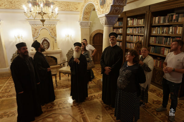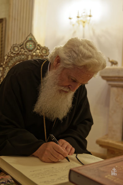 Ο Ιεράρχης της Εκκλησίας της Αλβανίας συζήτησε με τον Καθηγούμενο για διάφορα επίκαιρα θέματα στην Ορθοδοξία. Στην συνέχεια, ο Αρχιμανδρίτης π. Δοσίθεος τους έδειξε τα κύρια περιεχόμενα του μοναστηριού, συμπεριλαμβανομένης και της Βιβλιοθήκης. Στο Βιβλίο επισκεπτών ο Μητροπολίτης κ. Νικόλαος έγραψε το εξής: