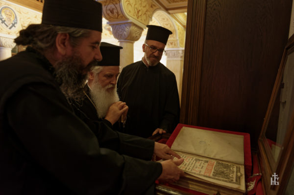 Ο Ιεράρχης της Εκκλησίας της Αλβανίας συζήτησε με τον Καθηγούμενο για διάφορα επίκαιρα θέματα στην Ορθοδοξία. Στην συνέχεια, ο Αρχιμανδρίτης π. Δοσίθεος τους έδειξε τα κύρια περιεχόμενα του μοναστηριού, συμπεριλαμβανομένης και της Βιβλιοθήκης. Στο Βιβλίο επισκεπτών ο Μητροπολίτης κ. Νικόλαος έγραψε το εξής:
