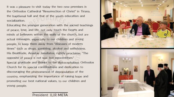 “Σήμερα είχα τη χαρά να ξεναγηθώ από τον Αρχιεπίσκοπο Αναστάσιο στους χώρους του Καθεδρικού Ναού της Αναστάσεως και να διαπιστώσω το μεγάλο έργο που επιτελεί η Εκκλησία στον τομέα της παιδείας και της κοινωνικής προσφοράς. Οφείλουμε μεγάλες ευχαριστίες προς την Ορθόδοξη Εκκλησία για το έργο αυτό και προς τον Αρχιεπίσκοπο Αναστάσιο ο οποίος μας τονίζει πάντα πως το αντίθετο της ειρήνης δεν είναι ο πόλεμος, αλλά ο εγωκεντρισμός”, αναφέρει σε ανάρτησή του ο Αλβανός Πρόεδρος.