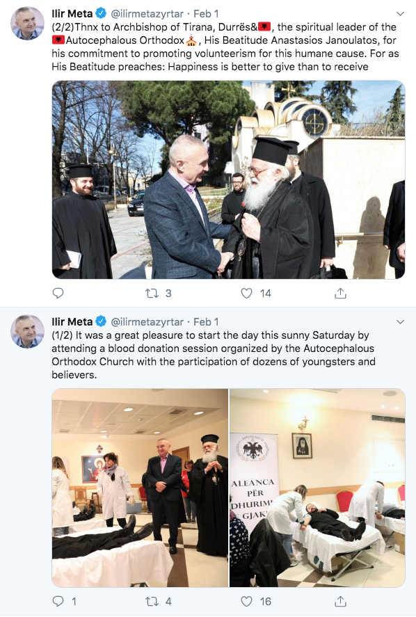 Κατά τη διάρκεια της αιμοδοσίας προσήλθε ο Πρόεδρος της Αλβανικής Δημοκρατίας Ιλίρ Μέτα, ο οποίος ευχαρίστησε τον Μακαριώτατο για τις δυναμικές πρωτοβουλίες που λαμβάνει και έχουν άμεση απήχηση στην Αλβανική κοινωνία. Παράλληλα, εξέφρασε τις ευχαριστίες του προς τους νέους που στηρίζουν τέτοιου είδους δράσεις της Εκκλησίας. Στη συνέχεια ο κ. Μέτα ξεναγήθηκε από τον Αρχιεπίσκοπο κ.κ. Αναστάσιο στους χώρους του Καθεδρικού Ναού, με το βαπτιστήριο να του κεντρίζει ιδιαίτερα το ενδιαφέρον.