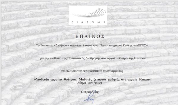 Καθηγητές και φοιτητές του Προγράμματος ελληνικής γλώσσας και πολιτισμού του Τμήματος Γλωσσών και Λογοτεχνίας του Πανεπιστημιακού Κολεγίου Λόγος συμμετείχαν στο δίκτυο συνεργασίας που δημιουργήθηκε στο πλαίσιο του εκπαιδευτικού προγράμματος «Υιοθεσία αρχαίων θεάτρων. Μαθητές ξεναγούν μαθητές στα αρχαία θέατρα», για την περίοδο 2022-2023.