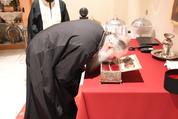 Πριν τη συνάντηση με τον Αρχιεπίσκοπο, ο Επίσκοπος Βύλιδος κ. Άστιος υποδέχθηκε τον Μητροπολίτη στον Καθεδρικό Ναό της Αναστάσεως του Χριστού όπου και τον ξενάγησε. Κατά την ξενάγηση στον ναό ο Σεβασμιώτατος προσκύνησε τα λείψανα του Αγίου Μάρτυρος Ιωάννη Βλαδίμηρου και του Αγίου Κοσμά του Αιτωλού.