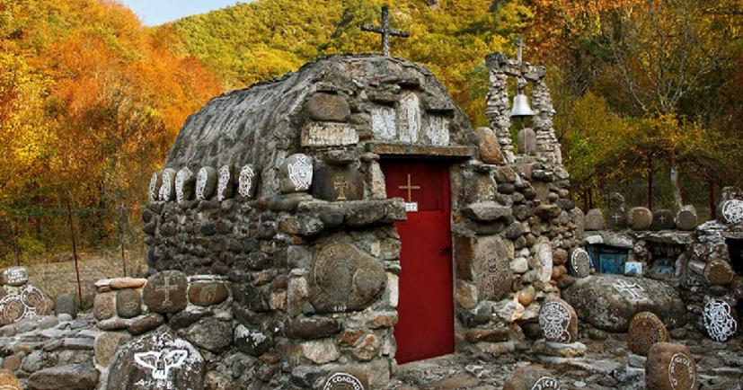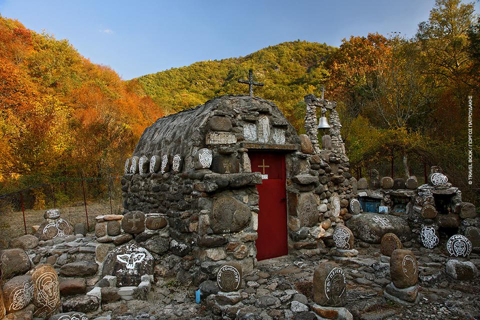 Εκκλησάκι σαν από παραμύθι φτιαγμένο από ποταμίσιες πέτρες, κάποιες χαραγμένες με το καλέμι, άλλες ζωγραφισμένες σε κάδρα και μια ταμπέλα «παρακαλώ μην αφήνετε χρήματα».