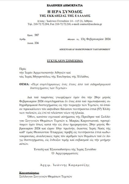 Διά τοῦ παρόντος γνωρίζομεν ὑμῖν ὅτι τήν 28ην μηνός Φεβρουαρίου 2024 συμπληροῦται ἕν ἔτος ἀπό τοῦ πρωτοφανοῦς σιδηροδρομικοῦ δυστυχήματος εἰς τήν περιοχήν τῶν Τεμπῶν, τό ὁποῖον προεκάλεσεν τόν αἰφνίδιον θάνατον πεντήκοντα ἑπτά (57) Ἑλλήνων πολιτῶν, ὡς ἐπί τό πλεῖστον νέων τῇ ἡλικίᾳ.