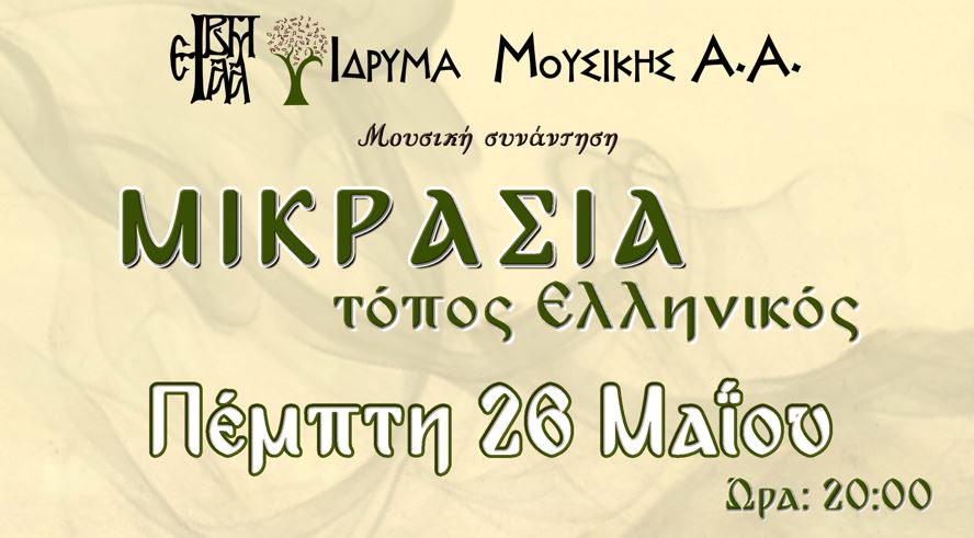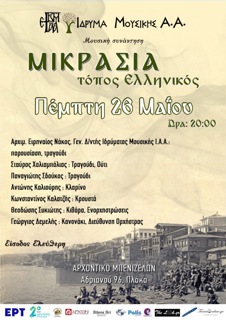 Μουσική εκδήλωση – συναυλία με τίτλο «Μικρασία τόπος Ελληνικός» θα πραγματοποιηθεί την Πέμπτη 26 Μαΐου 2022 και ώρα 20:00, στο «Αρχοντικό των Μπενιζέλων – Οικία Αγίας Φιλοθέης της Αθηναίας», από το Ίδρυμα Μουσικής της Ιεράς Αρχιεπισκοπής Αθηνών.