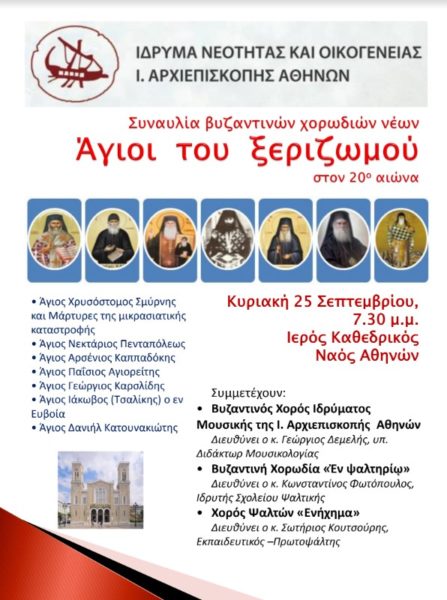 «Άγιοι του ξεριζωμού στον 20ο αιώνα» είναι ο τίτλος της Συναυλίας βυζαντινών Χορωδιών νέων, που θα πραγματοποιηθεί την Κυριακή 25 Σεπτεμβρίου, στις 7.30 μ.μ., στον Ιερό Καθεδρικό Ναό των Αθηνών.