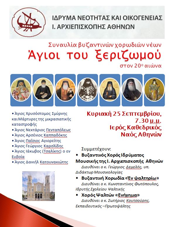 «Άγιοι του ξεριζωμού στον 20ο αιώνα» είναι ο τίτλος της Συναυλίας βυζαντινών Χορωδιών νέων, που θα πραγματοποιηθεί την Κυριακή 25 Σεπτεμβρίου, στις 7.30 μ.μ., στον Ιερό Καθεδρικό Ναό των Αθηνών.