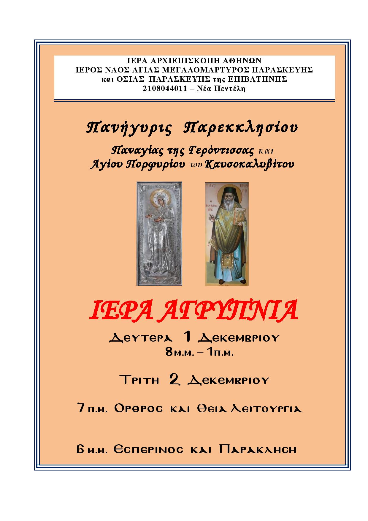 Πανηγυρίζει το Παρεκκλήσι Παναγίας της Γερόντισσας και Αγίου Πορφυρίου του Καυσοκαλυβίτου Νέας Πεντέλης. Ιερά Αγρυπνία θα τελεστεί τη Δευτέρα 1η Δεκεμβρίου, από τις 20:00 έως τη 1πμ., ενώ στις 7πμ θα τελεστεί ο Όρθρος και η Θεία Λειτουργία. Το απόγευμα στις 6μμ θα τελεστεί ο Εσπερινός και η Ιερά Παράκληση.