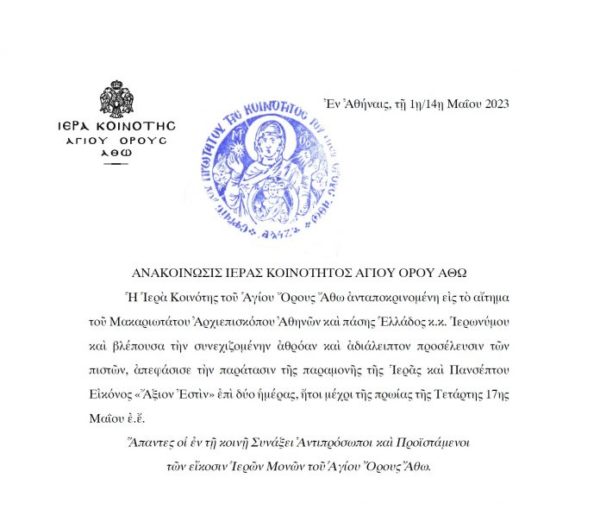 “Ἡ Ἱερὰ Κοινότης τοῦ Ἁγίου Ὄρους Ἄθω ἀνταποκρινομένη εἰς τὸ αἴτημα τοῦ Μακαριωτάτου Ἀρχιεπισκόπου Ἀθηνῶν καὶ πάσης Ἑλλάδος κ.κ. Ἱερωνύμου καὶ βλέπουσα τὴν συνεχιζομένην ἀθρόαν καὶ ἀδιάλειπτον προσέλευσιν τῶν πιστῶν, ἀπεφάσισε τὴν παράτασιν τῆς παραμονῆς τῆς Ἱερᾶς καὶ Πανσέπτου Εἰκόνος «Ἄξιον Ἐστὶν» ἐπὶ δύο ἡμέρας, ἤτοι μέχρι τῆς πρωίας τῆς Τετάρτης 17ης Μαΐου ἐ.ἔ.”, αναφέρειη ανακοίνωση της Ιεράς Κοινότητας η οποία εκδόθηκε χθες.