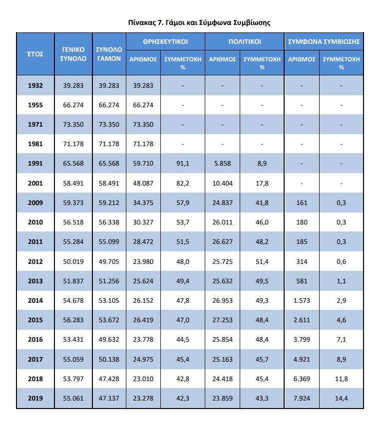 θρησκευτικοί και 24.418 πολιτικοί). Τα σύμφωνα συμβίωσης το 2019 ανήλθαν σε 7.924, παρουσιάζοντας αύξηση 24,4% έναντι του 2018 που ήταν 6.369. Στα σύμφωνα συμβίωσης του έτους 2019