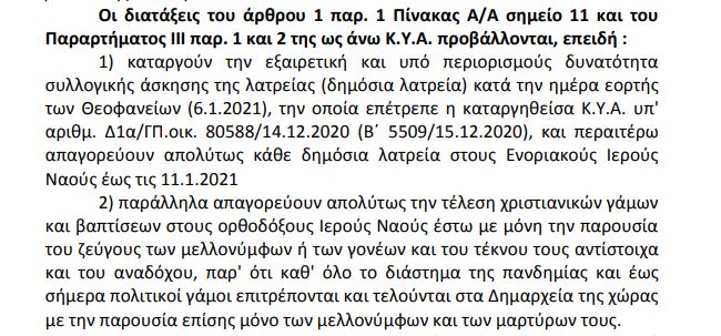 Ωστόσο, ανέδειξαν ένα ακόμα μείζον θέμα: Με βάσει τα περιοριστικά μέτρα που έχουν επιβληθεί απαγορεύεται η τέλεση γάμων και βαπτίσεων, παρά το γεγονός ότι οι πολιτικοί γάμοι και οι ονοματοδοσίες τελούνται κανονικά. Οι ίδιες πληροφορίες αναφέρουν ότι υπάρχει έντονος προβληματισμός στην Ιερά Σύνοδο για το γεγονός αυτό, καθώς απομακρύνει τα νέα ζευγάρια από την Εκκλησία.
