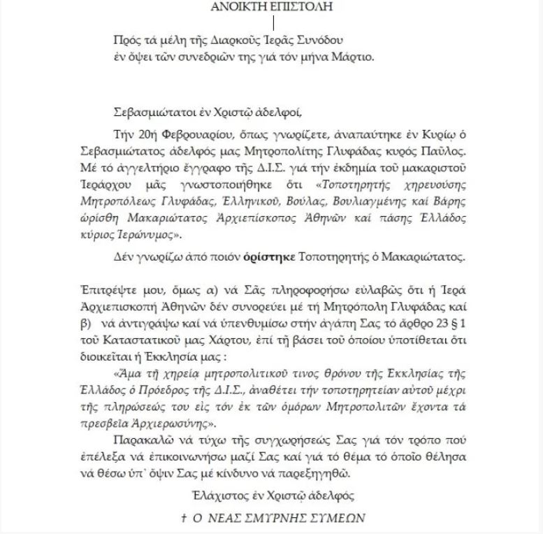 Ανοικτή επιστολή προς τα μέλη της Διαρκούς Ιεράς Συνόδου απέστειλε ο Σεβ. Μητροπολίτης Νέας Σμύρνης κ. Συμεών. Στην επιστολή του ο Μητροπολίτης εκφράζει την απορία του για το πως ορίστηκε τοποτηρητής της χηρεύουσας Μητρόπολης Γλυφάδας ο Μακαριώτατος Αρχιεπίσκοπος Αθηνών κ. Ιερώνυμος, από τη στιγμή που η Ιερά Αρχιεπισκοπή δεν συνορεύει με την Μητρόπολη Γλυφάδας. Μάλιστα ο Μητροπολίτης αναφέρεται στο άρθρο 23 παρ. 1 του Καταστατικού Χάρτη της Εκκλησίας της Ελλάδος οποίος αναφέρει ότι: “Άμα τη χηρεία μητροπολιτικού τινος θρόνου της Εκκλησίας της Ελλάδος ο Πρόεδρος της Δ.Ι.Σ., αναθέτει την τοποτηρητείαν αυτού μέχρι της πληρώσεως του εις τον εκ των ομόρων Μητροπολιτών έχοντα τα πρεσβεία Αρχιερωσύνης”.