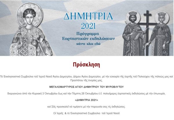Το Εκκλησιαστικό Συμβούλιο του Ιερού Ναού Αγίου Δημητρίου, Δήμου Αγίου Δημητρίου, με την ευκαιρία της πανηγύρεως του Πολιούχου της πόλεως και Προστάτου της συγκεκριμένης ενορίας (26 Οκτωβρίου), διοργανώνει από την Κυριακή 3 Οκτωβρίου έως και την Πέμπτη 28 Οκτωβρίου 2021, πολυήμερες εορταστικές εκδηλώσεις, τα επονομαζόμενα «ΔΗΜΗΤΡΙΑ 2021».