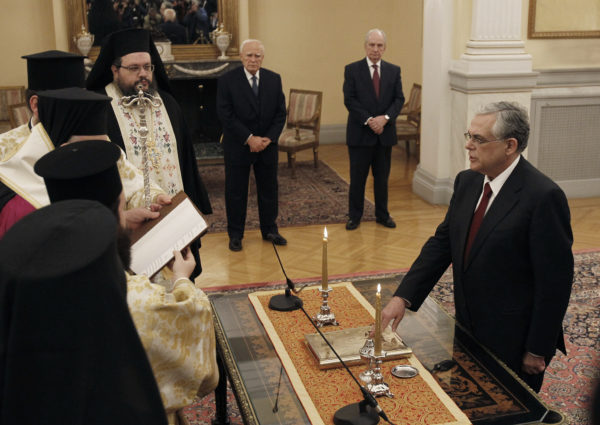 Ακολούθησε τον Νοέμβριο του 2011 η ορκωμοσία της κυβέρνησης Λουκά Παπδήμου. Ο Λουκάς Παπαδήμος ανέλαβε την προεδρία της μεταβατικής κυβέρνησης μετά από συμφωνία του τότε Πρωθυπουργού, Γιώργου Α. Παπανδρέου, του Αρχηγού της Αξιωματικής Αντιπολίτευσης, Αντώνη Σαμαρά, και του Προέδρου του Λαϊκού Ορθόδοξου Συναγερμού, Γιώργου Καρατζαφέρη.