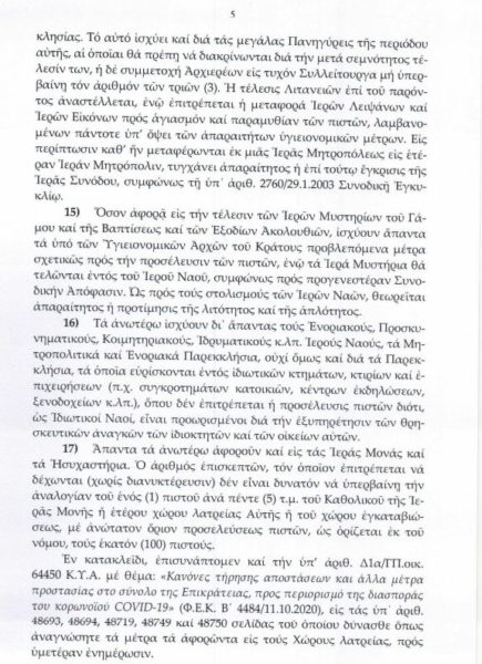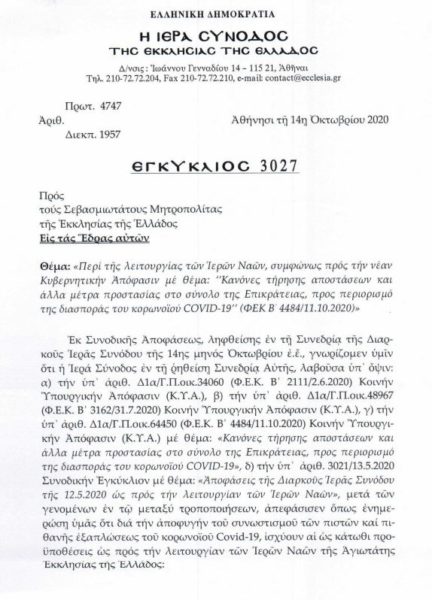Εγκύκλιο σημείωμα αναφορικά με τη λειτουργία των Ιερών Ναών, σύμφωνα με τη νέα κυβερνητική απόφαση με θέμα “Κανόνες τήρησης αποστάσεων και άλλα μέτρα προστασίας στο σύνολο της Επικράτειας, προς περιορισμό της διασποράς του κορωνοϊού COVID-19” εξέδωσε η Ιερά Σύνοδος της Εκκλησίας της Ελλάδος, το οποίο απεστάλη σε όλες τις Μητροπόλεις. Η εγκύκλιος εξεδόθη μετά από Συνοδική Απόφαση κατά τη χθεσινή (14 Οκτωβρίου) συνεδρίαση της ΔΙΣ