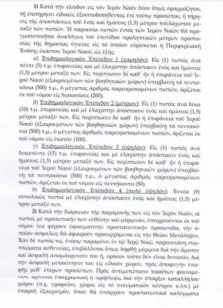 Επιδημιολογικό Επίπεδο 1 (χαμηλό): Ένας πιστός ανά πέντε τ. μέτρα επιφανείας και με ελάχιστη απόσταση 1,5 μ. μεταξύ τους. Σε περίπτωση που η επιφάνεια του Ιερού Ναού (εξαιρουμένων των βοηθητικών χώρων) υπερβαίνει τα 500 τ.μ. ο μέγιστος αριθμός των παρευρισκομένων δεν μπορεί να υπερβαίνει τα 200 άτομα.