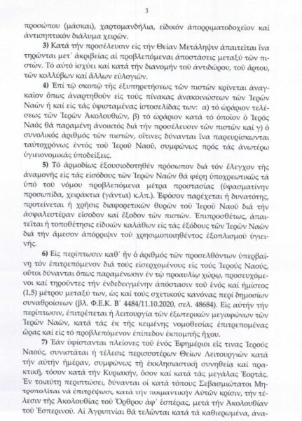 3.Ο φυσικός αερισμός των χώρων λατρείας είναι υποχρεωτικός καθ’ όλη την διάρκεια λειτουργίας τους. Σε περίπτωση χρήσης τεχνητού κλιματισμού, πρέπει να εξασφαλίζεται ταυτόχρονα και φυσικός αερισμός με ανοικτές πόρτες και παράθυρα.