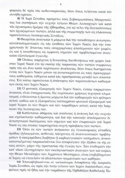 4.Εφόσον κάποιος παρουσιάσει συμπτώματα ασθένειας, θα πρέπει να απομακρύνεται με ευθύνη του κατά νόμο υπεύθυνου θρησκευτικού λειτουργού από τον χώρο λατρείας, τηρώντας τις απαραίτητες προφυλάξεις. Εφόσον δεν είναι δυνατή η άμεση απομάκρυνσή του, πρέπει να απομονωθεί προσωρινά μέχρι την ασφαλή απομάκρυνσή του, αποφεύγοντας την επαφή με άλλα άτομα. Για τον σκοπό αυτό πρέπει να έχει προβλεφθεί ειδικός χώρος με εξαερισμό, μάσκες, χαρτομάντηλα, πλαστική σακούλα για απόρριψη αυτών και αντισηπτικό χεριών.