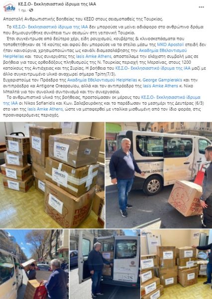 Στο πλαίσιο αυτό συγκεντρώθηκαν από δεύτερο χέρι, είδη ρουχισμού, κουβέρτες και κλινοσκεπάσματα που τοποθετήθηκαν σε 16 κούτες και αφού δεν ήταν δυνατό να σταλούν μέσω της ΜΚΟ «ΑΠΟΣΤΟΛΗΣ» επειδή δεν ήταν καινούργια, χρησιμοποιήθηκαν ως κανάλι διαμεσολάβησης η Ακαδημία Εθελοντισμού “HelpHellas” και οι συνεργάτες της ΑμΚΕ «ΙΑΣΙΣ». Η βοήθεια του ΚΕ.Σ.Ο. μαζί με άλλο συγκεντρωμένο υλικό αναχώρησε την Τρίτη 7 Μαρτίου 2023 με προορισμό τους Ορθοδόξους πληθυσμούς της Νότιας Τουρκίας, στην περιοχή της Μερσίνας, και τους 1200 κατοίκους της Αντιόχειας και της Συρίας.