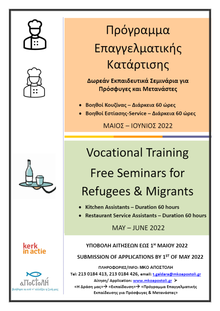Η δράση «Πρόγραμμα Επαγγελματικής Κατάρτισης», που υλοποιείται στο πλαίσιο του προγράμματος «APOSTOLI- ASSISTANCE AND TRAINING ΤΟ VULNERABLE COMMUNITIES ΙΝ ATHENS», αφορά στην εφαρμογή πιλοτικού προγράμματος επαγγελματικής κατάρτισης και ανάπτυξης δεξιοτήτων για πρόσφυγες και μετανάστες. Στόχος του προγράμματος είναι να δώσει τη δυνατότητα σε πρόσφυγες και μετανάστες, μέσω των σεμιναρίων που θα παρακολουθήσουν, να αποκτήσουν τεχνικές δεξιότητες που θα τους βοηθήσουν στην ομαλή ένταξή τους στο κοινωνικό σύνολο και την αγορά εργασίας. Για το σκοπό αυτό έχουν επιλεχτεί επαγγελματικοί τομείς με προοπτικές εύρεσης εργασίας όπως αυτοί του τουρισμού, της εστίασης και της κομμωτικής.