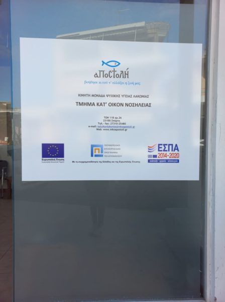 Το τμήμα Κατ’ οίκον Νοσηλεία Λακωνίας της “ΑΠΟΣΤΟΛΗΣ”, που χρηματοδοτείται από το Περιφερειακό Επιχειρησιακό Πρόγραμμα Πελοποννήσου – ΕΣΠΑ 2014-2020, αφορά υπηρεσίες ολοκληρωμένης κοινοτικής θεραπείας και υπηρεσίες κατ΄οίκον νοσηλείας ψυχικής υγείας στην κοινότητα.