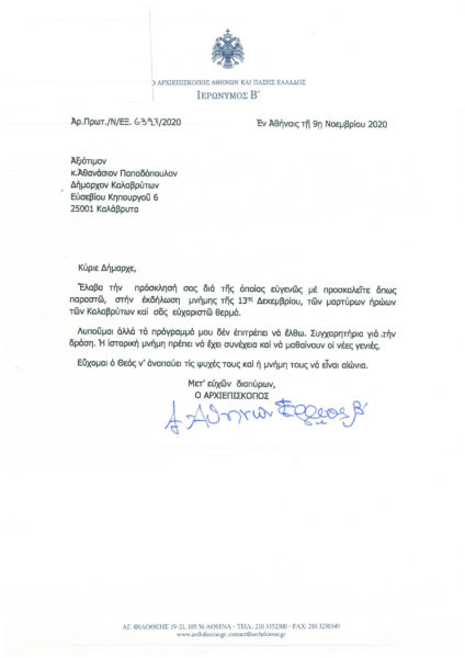“Η ιστορική μνήμη πρέπει να έχει συνέχεια και να μαθαίνουν οι νέες γενιές” τονίζει σε επιστολή που απέστειλε προς το Δήμαρχο Καλαβρύτων κ. Αθανάσιο Παπαδόπουλο ο Αρχιεπίσκοπος Αθηνών και Πάσης Ελλάδος κ.κ Ιερώνυμος, εκφράζοντας παράλληλα την αδυναμία να παραστεί στις εκδηλώσεις μνήμης της 13ης Δεκεμβρίου για τα θύματα του Καλαβρυτινού Ολοκαυτώματος.