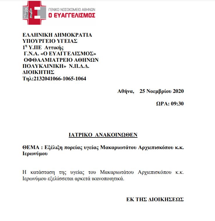 Αναφορικά τώρα με την πορεία της υγείας της Μακαριωτάτου αυτή εξελίσσεται «αρκετά ικανοποιητικά», σύμφωνα με το νεότερο ιατρικό ανακοινωθέν το οποίο εξέδωσε σήμερα Τετάρτη 25 Νοεμβρίου το Νοσοκομείο Ευαγγελισμός.