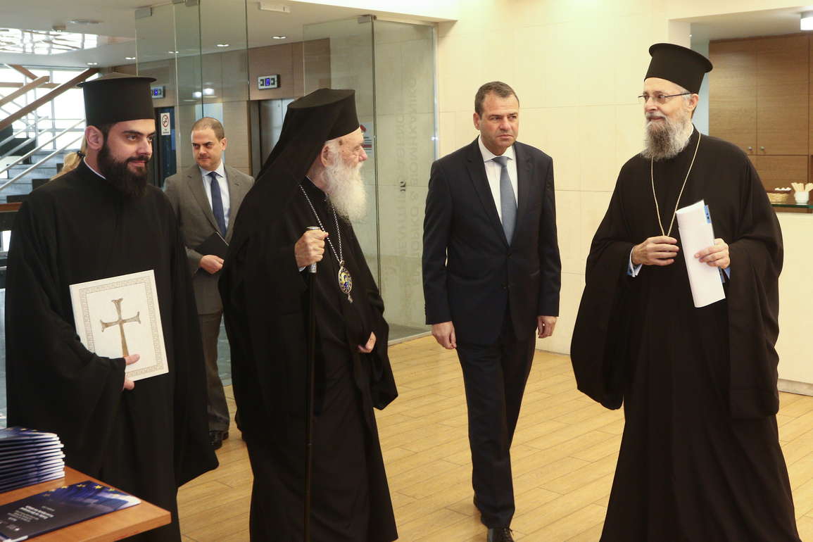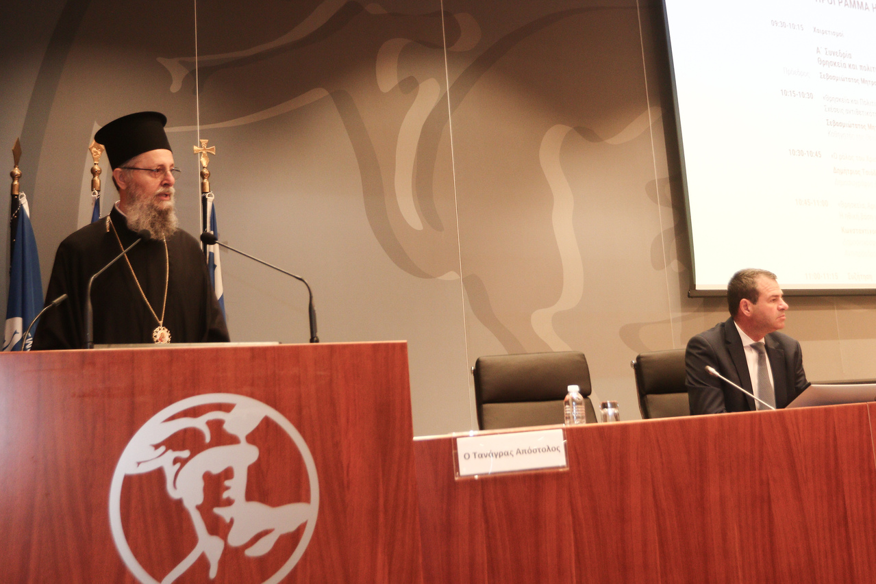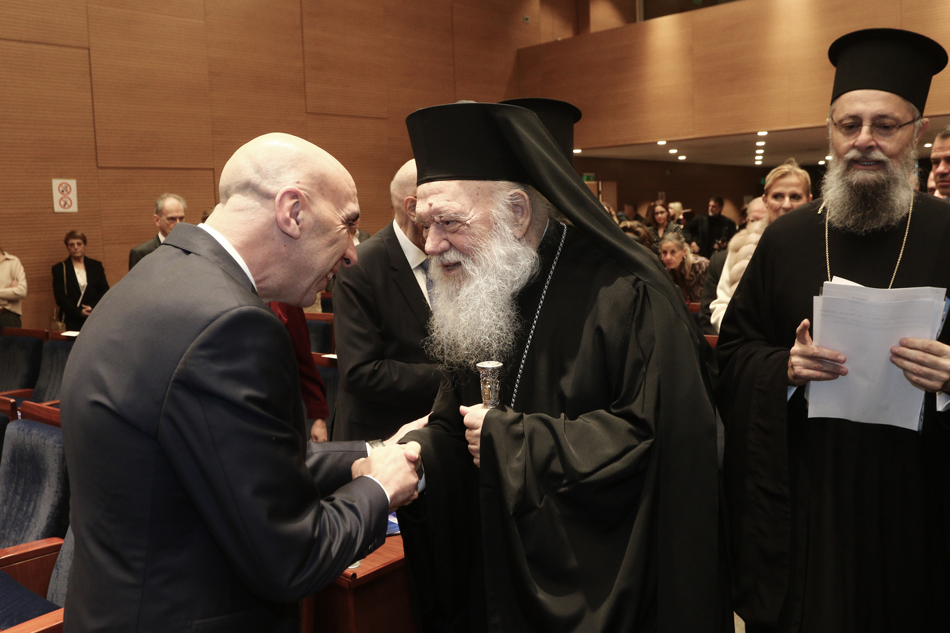 Ακολούθησε ο Χαιρετισμός του Μακαριωτάτου Αρχιεπισκόπου Αθηνών και πάσης Ελλάδος κ. Ιερωνύμου, ο οποίος αρχικά εξέφρασε τα θερμά του συγχαρητήρια στον Θεοφιλέστατο Επίσκοπο Τανάγρας κ. Απόστολο για την ουσιαστική αυτή πρωτοβουλία, που αναδεικνύει με σοβαρότητα τα κρίσιμα ζητήματα του ευρωπαϊκού δημόσιου βίου. Επίσης συνεχάρη το ΕΚΠΑ και το Υπουργείο Εξωτερικών, υπό την αιγίδα του οποίου ήταν η ημερίδα.