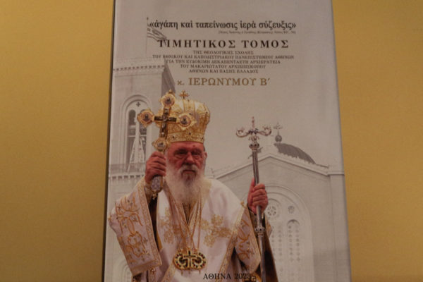 Ακόμη μία αναγνώριση αυτής της προσφοράς ήρθε από τον ακαδημαϊκό χώρο αυτή τη φορά. Η Θεολογική Σχολή Αθηνών σε μία σεμνή τελετή στην Κεντρική Αίθουσα του Εθνικού και Καποδιστριακού Πανεπιστημίου Αθηνών παρουσίασε χθες το βράδυ τον Αφιερωματικό Τόμο με αφορμή τα 15 χρόνια ευκλεούς Πρωθιεραρχίας του Μακαριωτάτου κ.κ. Ιερωνύμου.