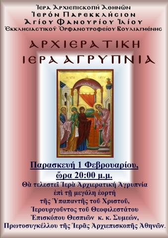 Ιερά Αρχιερατική Αγρυπνία θα τελεστεί στο Ιερό Παρεκκλήσιο του Αγίου Φανουρίου Ιλίου, την Παρασκευή 01/02/2019 στις 20:00μ.μ. για την μεγάλη εορτή της Υπαπαντής.