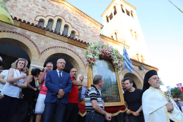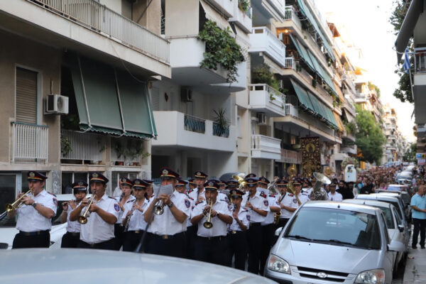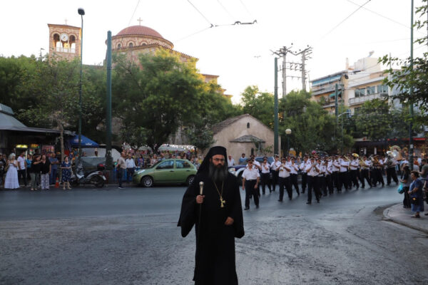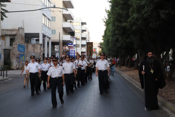 Η μπάντα του Δήμου, αφού συνόδευσε με τον ρυθμό της τη λιτανεία, παιάνισε στο τέλος τον Εθνικό Ύμνο.