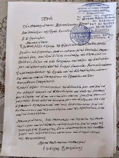 Έχοντας μόλις σήμερον 28 Αυγούστου 2021, λάβει πλήρη γνώσιν των γεγονότων που συνέβησαν με την επιστολή παραιτήσεως μου, που ενώ ο ίδιος συνέταξα τον περασμένο Ιούλιον, θέλω να σας εκφράσω και πάλιν την επιθυμιάν μου να αποσυρθώ από την ενεργό διακονία. Δυστυχώς κάποιοι εκμεταλλευόμενοι την ηλικία μου και την αδυναμία μου, κάνουν τα πάντα για να διατηρήσουν την εξουσία και έτσι ακυρώθηκε η παραίτηση.