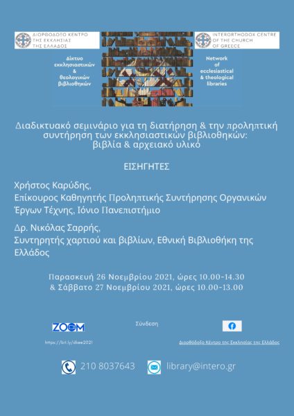 Το Διορθόδοξο Κέντρο της Εκκλησίας της Ελλάδος, εγκαινιάζοντας τις εκπαιδευτικές δράσεις του Δικτύου Εκκλησιαστικών και Θεολογικών Βιβλιοθηκών, διοργανώνει διαδικτυακό σεμινάριο για τη διατήρηση και την προληπτική συντήρηση των εκκλησιαστικών βιβλιοθηκών ως προς τα βιβλία και το αρχειακό υλικό.