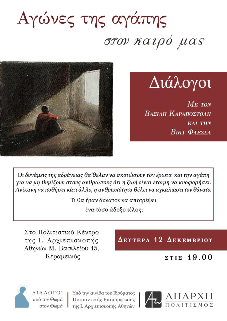 Εκδήλωση με τίτλο «Διάλογοι: Από τον Θωμά στον Θωμά· Αγώνες Αγάπης στον καιρό μας» διοργανώνουν το Ίδρυμα Ποιμαντικής Επιμόρφωσης της Ιεράς Αρχιεπισκοπής Αθηνών σε συνεργασία με την Απαρχή την Δευτέρα 12 Δεκεμβρίου στις 19:00 στο Πολιτιστικό Κέντρο της Ιεράς Αρχιεπισκοπής Αθηνών (Μεγάλου Βασιλείου 15, Κεραμεικός).