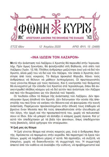 ΔΙΑΒΑΣΤΕ ΕΔΩ τη “Φωνή Κυρίου” της Κυριακής των Βαϊων 2020 της Αποστολικής Διακονίας της Εκκλησίας της Ελλάδος, η οποία, δυστυχώς, λόγω της προσωρινής απαγορεύσεως του ερχομού των πιστών στη Θεία Λειτουργίες και τις Ιερές Ακολουθίες, δε θα μοιραστεί, χέρι με χέρι, όπως πάντοτε, προς το ευσεβές πλήρωμα της Εκκλησίας μας, πανελλαδικώς αλλά και παγκοσμίως.