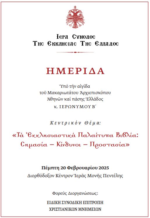 Κατόπιν Συνοδικής Αποφάσεως, ληφθείσης κατά τη Συνεδρία της Διαρκούς Ιεράς Συνόδου της 9ης Δεκεμβρίου 2024, η Ιερά Σύνοδος της Εκκλησίας της Ελλάδος, ύστερα από εισήγηση της Ειδικής Συνοδικής Επιτροπής επί των Χριστιανικών Μνημείων, διοργανώνει Επιστημονική Ημερίδα υπό τον τίτλο: «Τα Εκκλησιαστικά Παλαίτυπα Βιβλία: Σημασία – Κίνδυνοι – Προστασία».