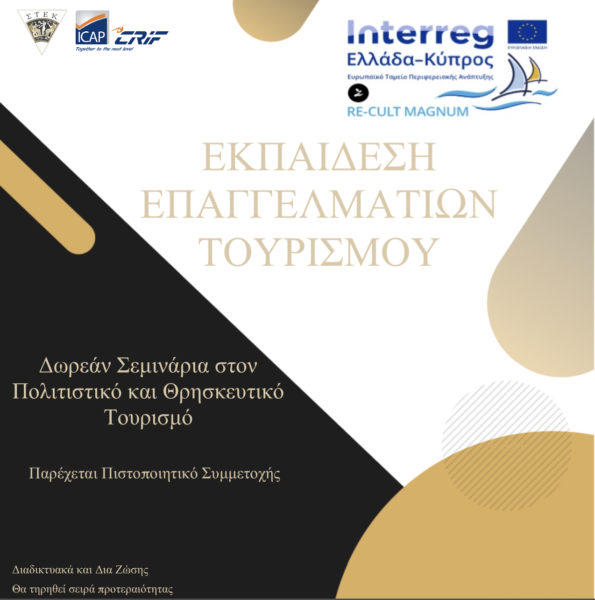 Ο Σύνδεσμος Τουριστικών Επιχειρήσεων Κύπρου (ΣΤΕΚ), στο πλαίσιο του προγράμματος Συνεργασίας INTERREG V-A Ελλάδας-Κύπρου 2014-2020 και της πράξης Re-Cult Magnum, καλεί όλους τους επαγγελματίες του τουριστικού κλάδου, αλλά και όλους όσοι ενδιαφέρονται να γνωρίσουν καλύτερα την πολιτιστική και θρησκευτική μας κληρονομιά, να παρακολουθήσουν το σεμινάριο επιμόρφωσης που παρέχεται δωρεάν και στοχεύει στην προώθηση του Θρησκευτικού Τουρισμού στην Ελλάδα και την Κύπρο.
