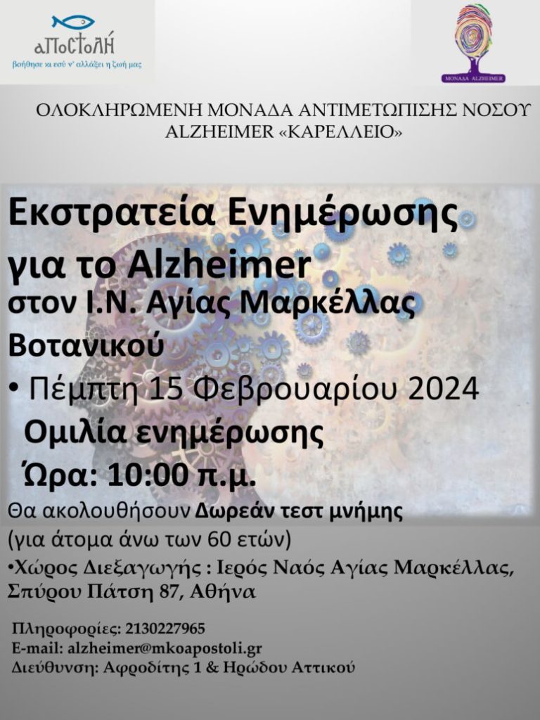 Την Πέμπτη 15 Φεβρουαρίου 2024 και ώρα 10:00 π.μ., η δράση θα διεξαχθεί στον Ιερό Ναό Αγίας Μαρκέλλας Βοτανικού, όπου το επιστημονικό προσωπικό της Ολοκληρωμένης Μονάδας Alzheimer θα δώσει ενημερωτική ομιλία σε σχέση με την νόσο Alzheimer και κυρίως με την πρόληψη της ενώ στη συνέχεια θα χορηγηθούν δωρεάν τεστ μνήμης σε όσα άτομα άνω των 60 ετών το επιθυμούν.