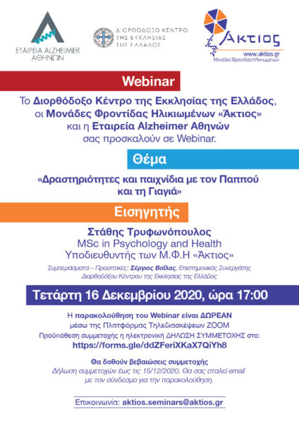 Οι εορταστικές ημέρες που έρχονται αποτελούν ευκαιρία για να περάσουμε περισσότερο ποιοτικό χρόνο με τους μεγαλύτερους συνανθρώπους μας. Γι’ αυτόν τον λόγο, τo Διορθόδοξο Κέντρο της Εκκλησίας της Ελλάδος, οι Μονάδες Φροντίδας Ηλικιωμένων «Άκτιος» και η Εταιρεία Alzheimer Αθηνών σας προσκαλούν σε Webinar, που διοργανώνουν την Τετάρτη 16 Δεκεμβρίου 2020, με θέμα: «Δραστηριότητες και παιχνίδια με τον Παππού και τη Γιαγιά».