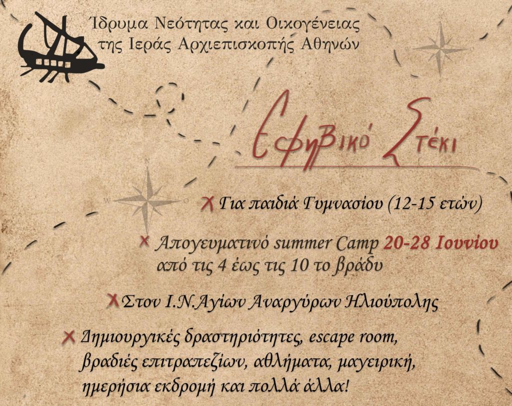 Το Ίδρυμα Νεότητας και Οικογένειας της Ιεράς Αρχιεπισκοπής Αθηνών βρίσκεται στην ευχάριστη θέση να ανακοινώσει την έναρξη των Θερινών Απογευματινών δραστηριοτήτων με τίτλο : «Εφηβικό Στέκι».