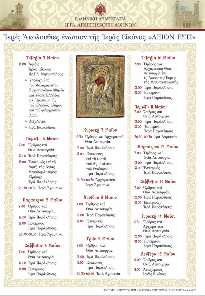 Επίκεντρο λατρευτικών εκδηλώσεων αναμένεται να είναι τις ημέρες παραμονής της Ιεράς Εικόνας στην Αθήνα ο Ιερός Καθεδρικός Ναός Ευαγγελισμού της Θεοτόκου όπου καθημερινά θα τελούνται ιερές ακολουθίες (Όρθρος, Θεία Λειτουργία, Ιερές Παρακλήσεις, Εσπερινός). Οι ακολουθίες αναμένεται να τελεστούν σύμφωνα με το ακόλουθο πρόγραμμα: