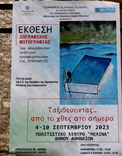 Έκθεση με έργα ζωγραφικής και φωτογραφίας που έχουν δημιουργήσει ασυνόδευτα προσφυγόπουλα που φιλοξενούνται στις δομές του Οργανισμού «ΣΥΝΥΠΑΡΞΙΣ» της Εκκλησίας της Ελλάδος πραγματοποιείται στο πολιτιστικό Κέντρο «Μελίνα» του Δήμου Αθηναίων στο Θησείο.