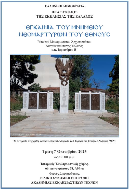 Η Ιερά Σύνοδος της Εκκλησίας της Ελλάδος, διά της Ειδικής Συνοδικής Επιτροπής Ακαδημίας Εκκλησιαστικών Τεχνών, ευχαρίστως ανακοινώνει την Τέλεση Εγκαινίων του Μνημείου Νεομαρτύρων του Έθνους, το οποίο ανηγέρθη κατόπιν ευγενούς δωρεάς του Ιδρύματος Σταύρος Νιάρχος (ΙΣΝ).