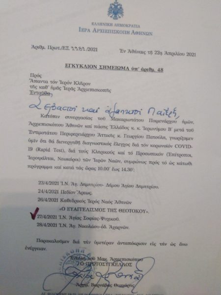 Εκδόθηκε χθες η εγκύκλιος που μιλά για την πρόβλεψη της Περιφέρειας Αττικής να διαθέσει δωρεάν τεστ σε ιερείς και προσωπικό των ναών, δέσμευση που πάρθηκε και ανακοινώθηκε από τον Περιφερειάρχη Αττικής, Γιώργο Πατούλη στον Μακαριώτατο Αρχιεπίσκοπο Αθηνών και πάσης Ελλάδος κ.κ. Ιερώνυμο κατά την επίσκεψη του πρώτου στην Αρχιεπισκοπή Αθηνών.